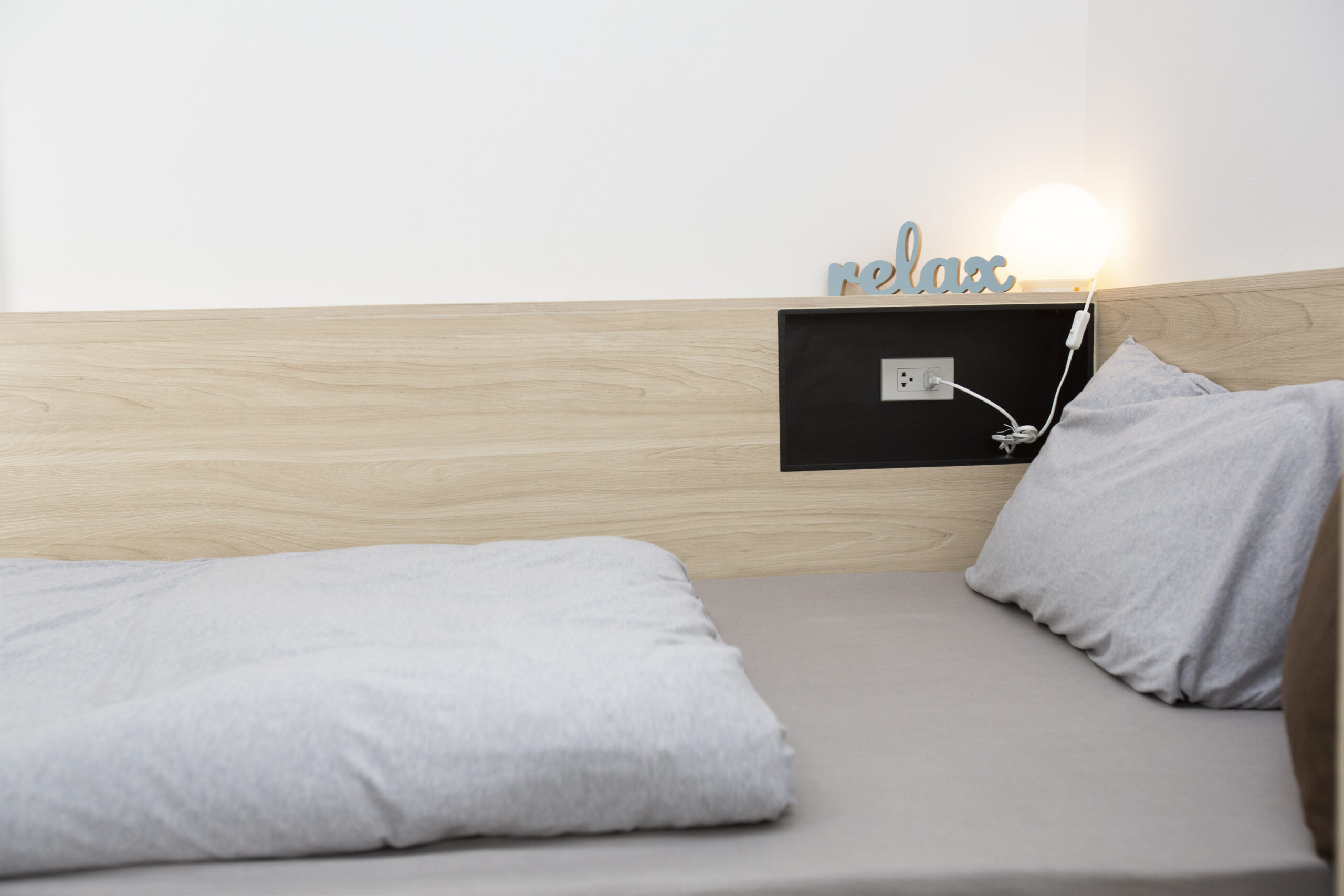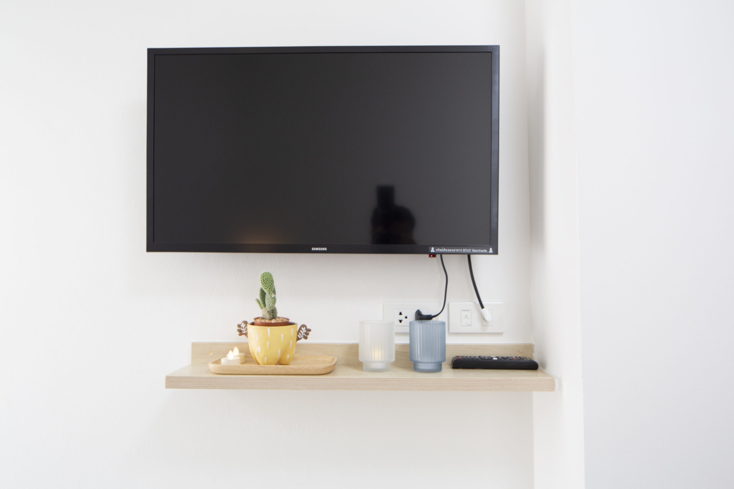 ห้องพักตกแต่งเฟอร์นิเจอร์บิ้วท์อินครบชุด พร้อมทีวีและตู้เย็น